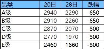 9日之间,黄板类价格下跌650-800元/吨不等。单次下调价幅度更是从20日的30元/吨飙升至28日的300-350元/吨。