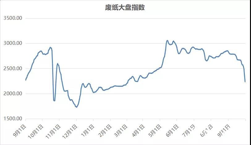 截至2018年9月28日早上9:00,废纸价格指数跌至2233.87,并且还有继续下跌的趋势。