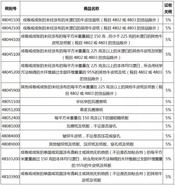 此外,9月1日及12月15日加征关税的名单中,还涉及与6月1日重复加税的48043100和48044900两个税则号。两个税则号6月份关税为20%,9月份加征关税10%,总关税为32%。